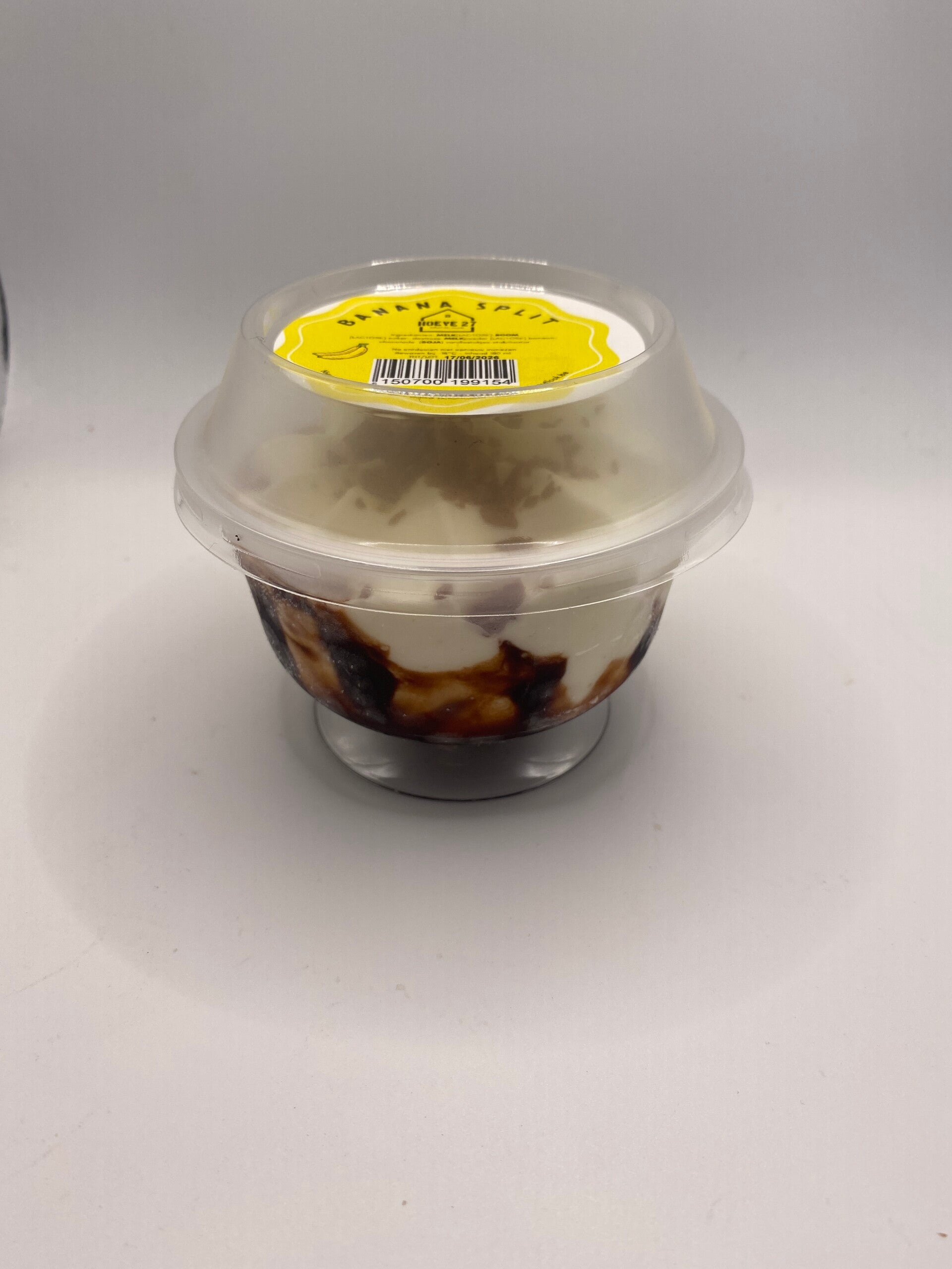 Coupe gevuld met bananenijs en afgewerkt met chocoladesausje