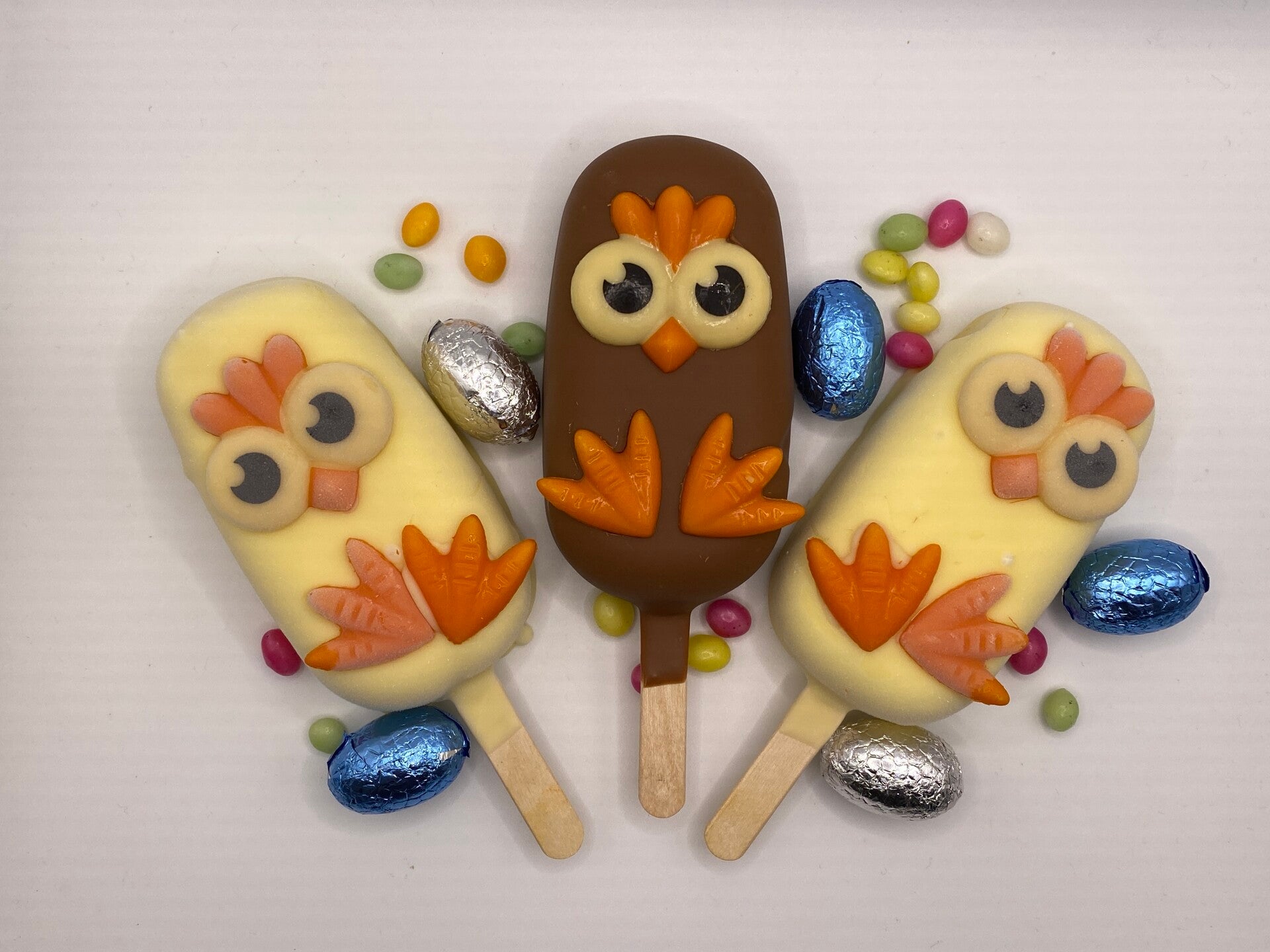 Gevuld met vanilleroomijs afgewerkt met witte chocolade en melkchocolade.